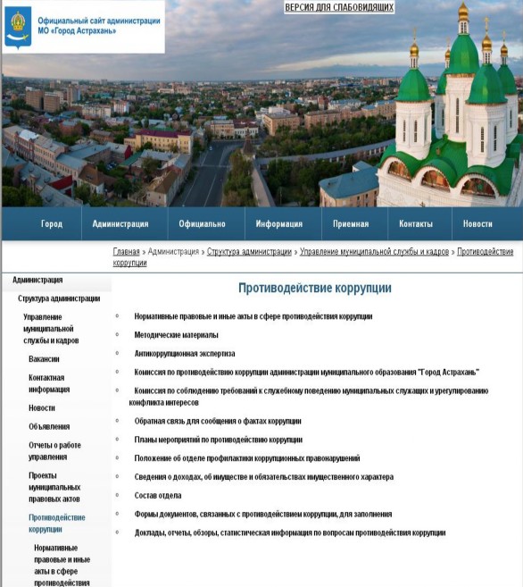 Раздел "Противодействие коррупции" на официальном сайте администрации МО "Город Астрахань"